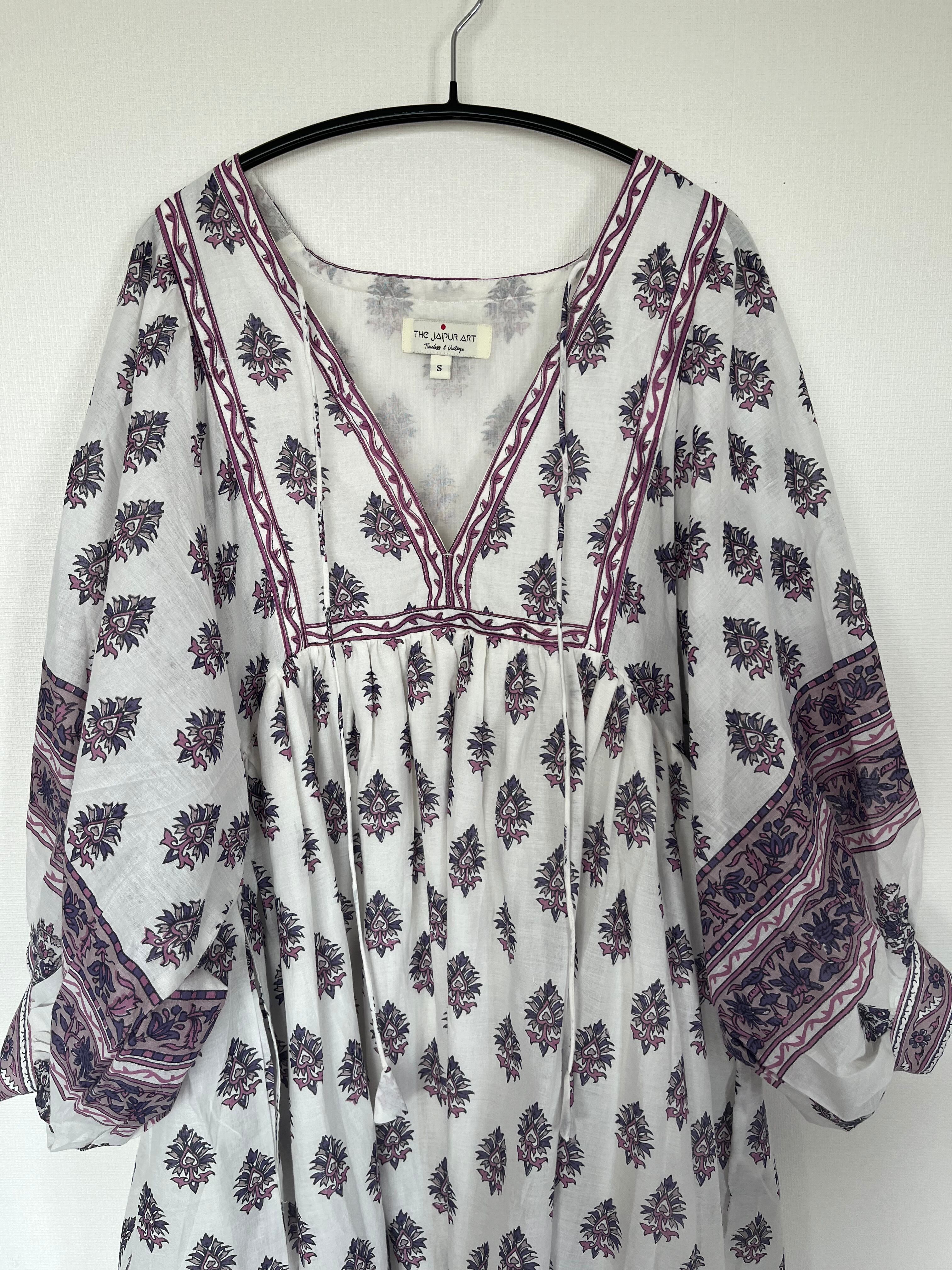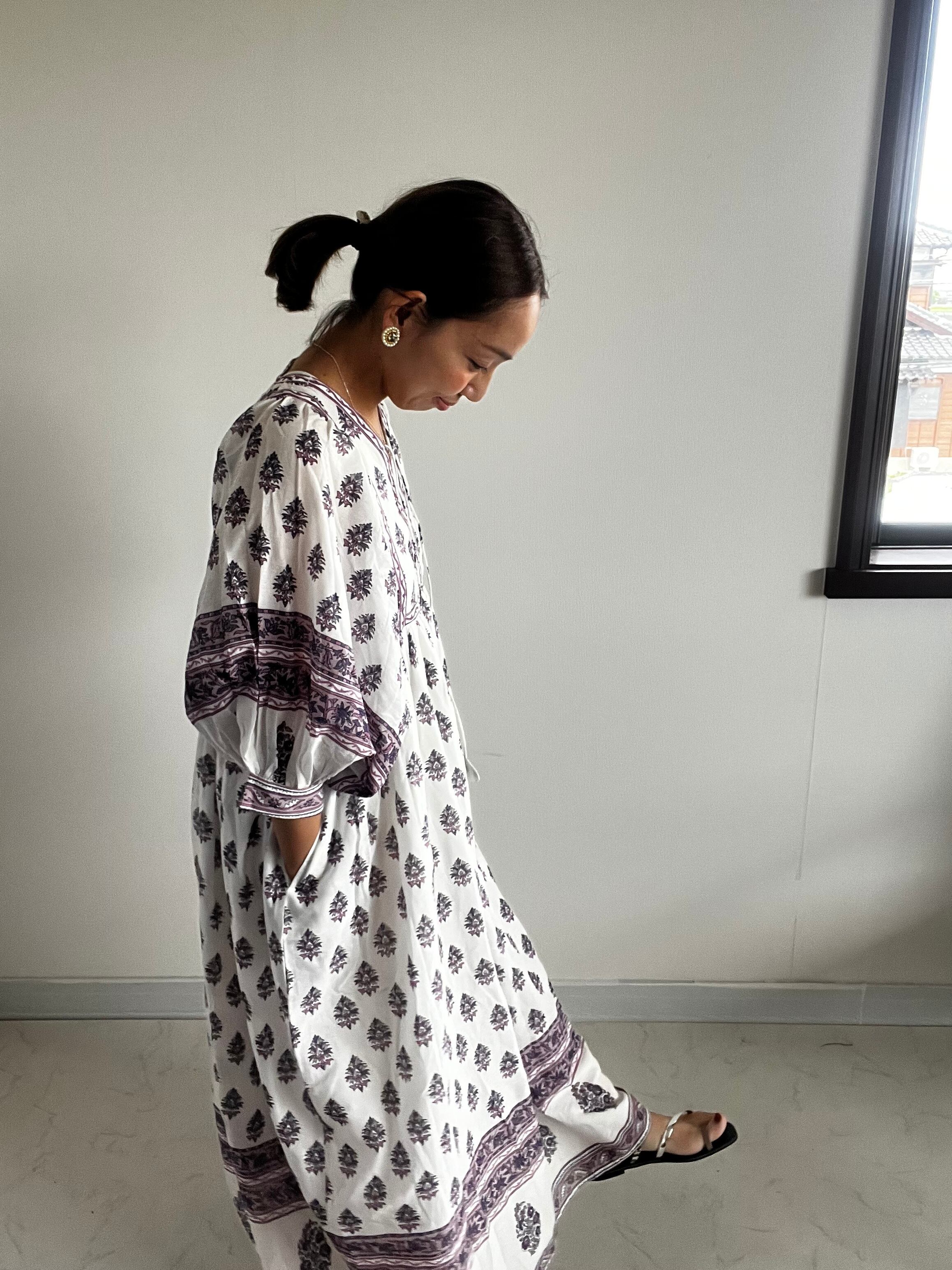Mサイズ・インド綿ナチュラルワンピース【白×パープル】
