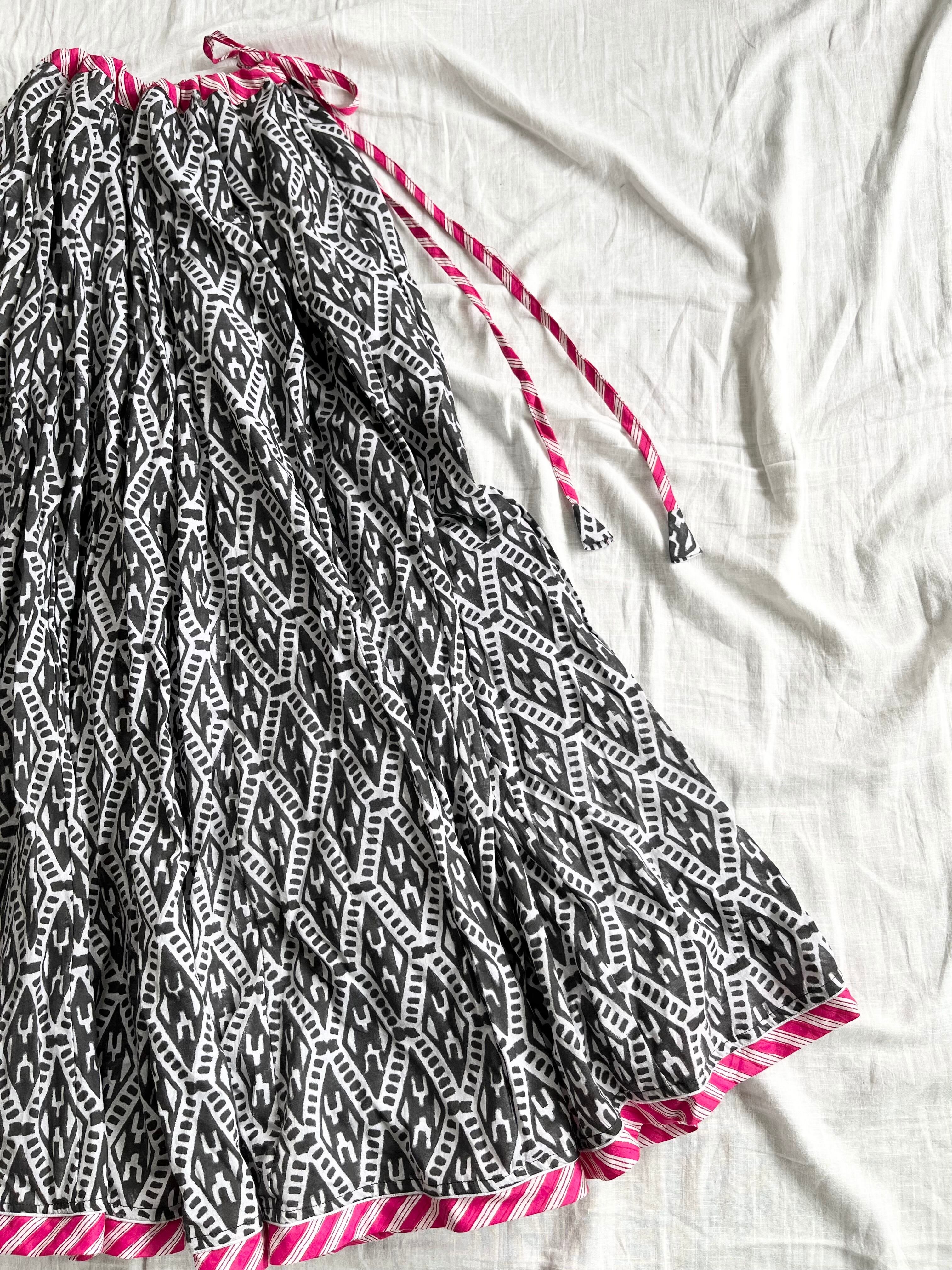 パネル状の生地を32枚はぎ合わせた、フルサークルのガーグラースカートです。