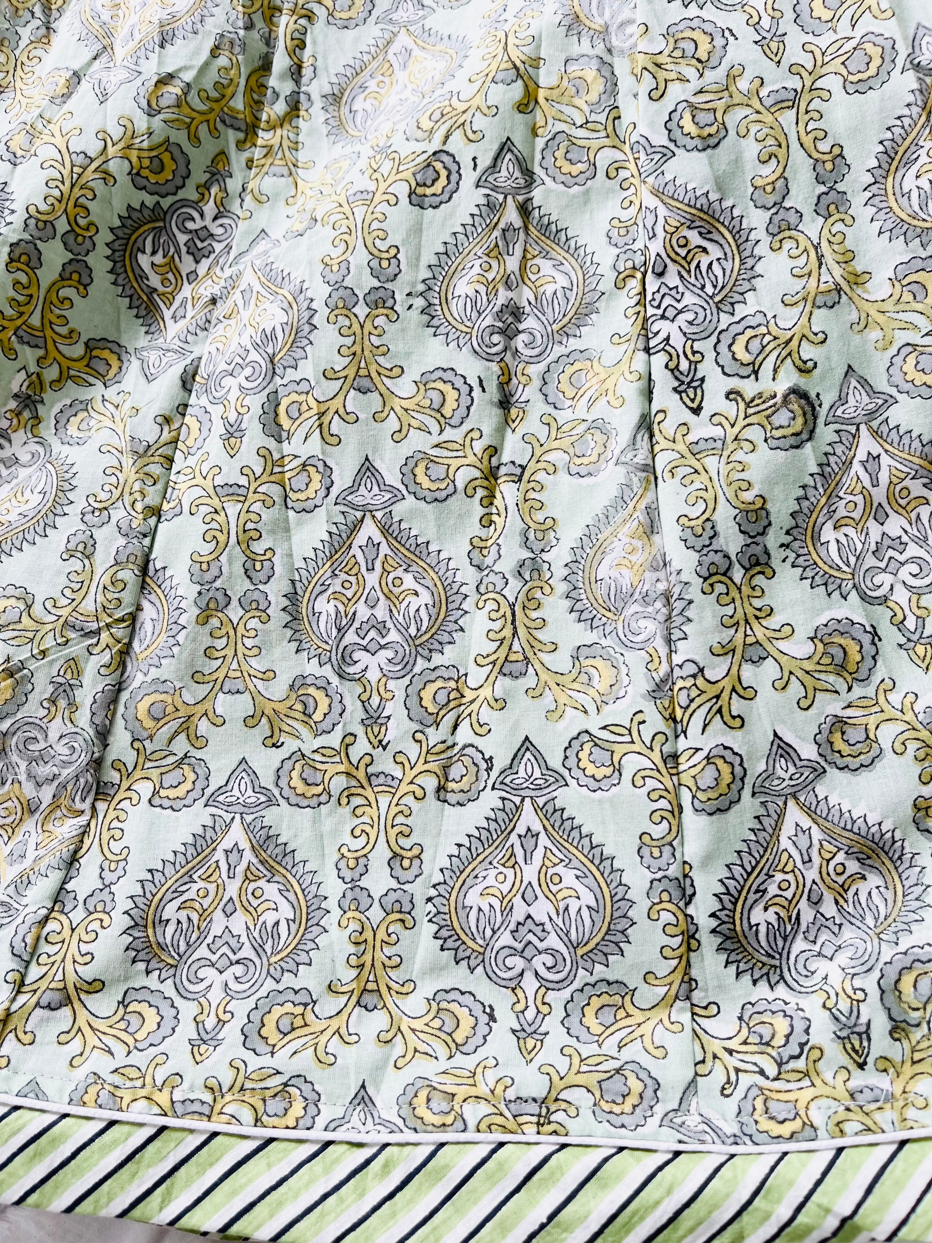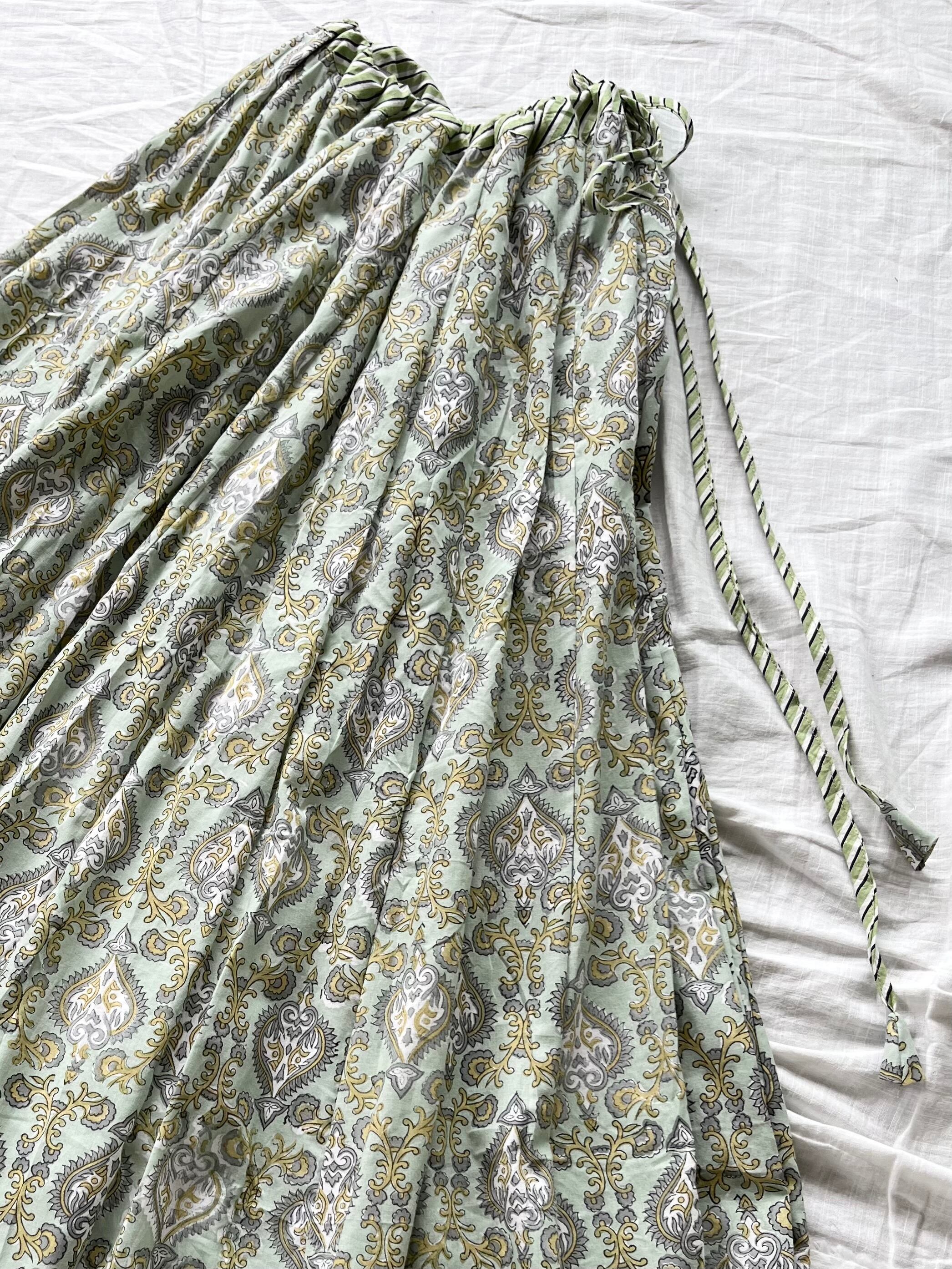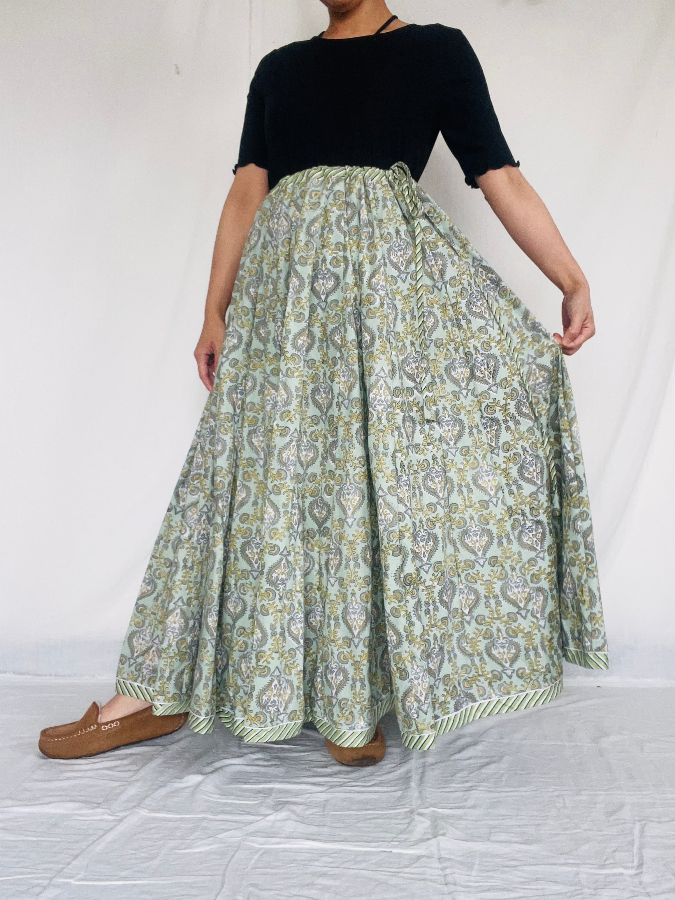 パネル状の生地を32枚はぎ合わせた、フルサークルのガーグラースカートです。